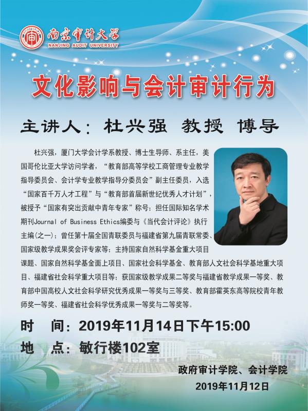 【讲座通知】主讲人:杜兴强 教授、博导 题目:《文化影响与会计审计行为》