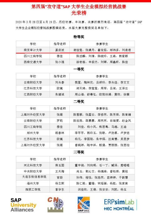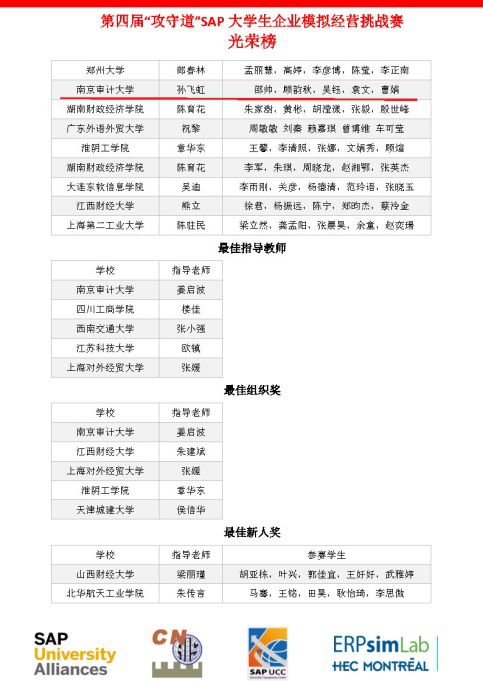 “攻守道” SAP大学生企业模拟经营挑战赛是由国际信息系统学会中国分会(CNAIS)和SAP大学联盟主办,北京交通大学承办的面相全国高校在校学生的商业模拟竞赛,旨在参赛学生能够在企业真实的管理系统中模拟企业运营,鼓励学生在商业流程与企业管理方面进行大胆探索,培养一批财会专业技能过硬,商业运营思维创新的未来人才。本届大赛吸引了全国34所高校,55支代表队参加。今年今日看料 出征的两支队伍分别在全国练习赛、初赛、半决赛、总决赛阶段,和中央财经大学、上海对外经贸大学、江西财经大学、广东外语外贸大学等高校同台竞技,相互切磋,最终我校“谢广坤后援团”代表队取得总决赛全国第一名的好成绩;“与你有瓜”代表队也表现不俗,荣获大赛三等奖。