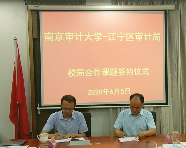 6月5日,我校政府审计学院与南京江宁区审计局战略合作协议签订仪式在江宁区审计局举行,江宁区审计局副局长奚玉国,南京市审计局社保审计处副处长李吉坤,我校政府审计学院执行院长陈骏,经济学院党总支书记孙文远,政府审计学院许莉、后小仙等部分骨干教师出席了签约仪式,仪式由政府审计学院政府审计系主任陈希晖主持。