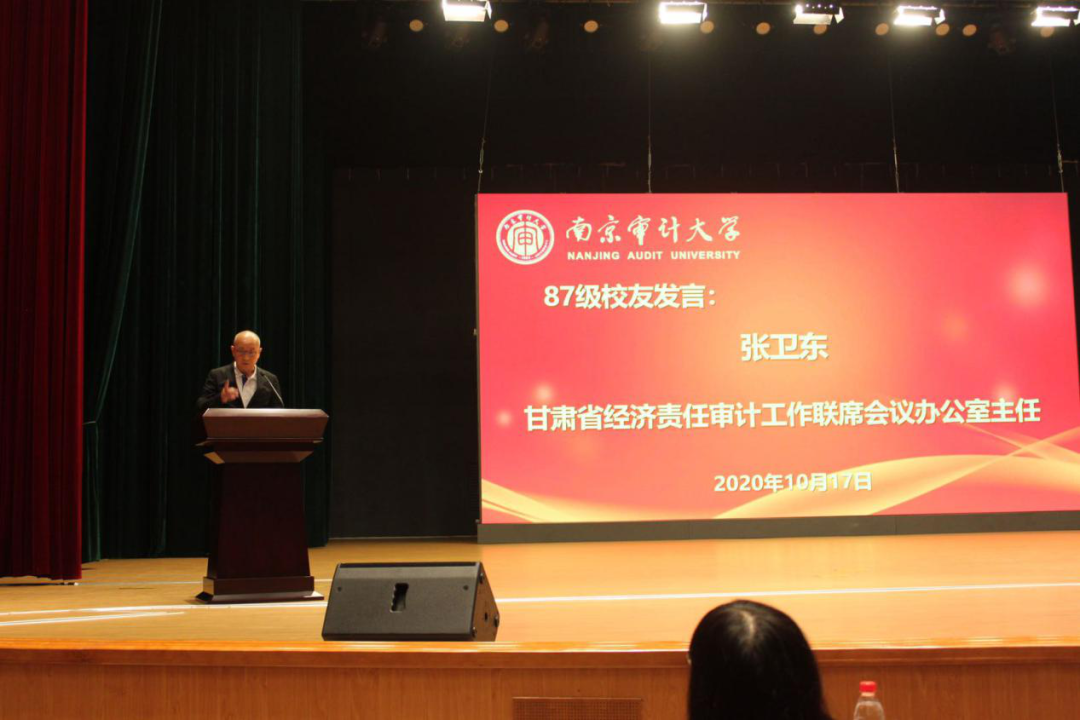87级审计专业校友,甘肃省经济责任审计工作联席会议办公室主任张卫东做了题为“追忆校园生活 分享生活感悟”的分享,强调学习是在校学生的第一任务,同时希望大家在校期间一定要多读书读好书、做好文字历练、多参加集体活动、锻炼个人品德,加强自身的修养,成为一个全面发展的优秀大学生。
