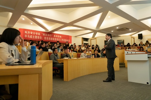 活动最后,周维培院长进行了总结和点评。他认为大数据审计前景广阔,传统的审计需要大数据的支撑。周院长鼓励同学们在深入学习大数据与审计知识的同时扩展自己的视野,广泛涉猎各领域的知识使自己适应审计模式的变化。周维培院长代表学院感谢董常凌先生与同学们分享自己的宝贵经验,并聘请董先生担任政府审计学院校外实践导师。