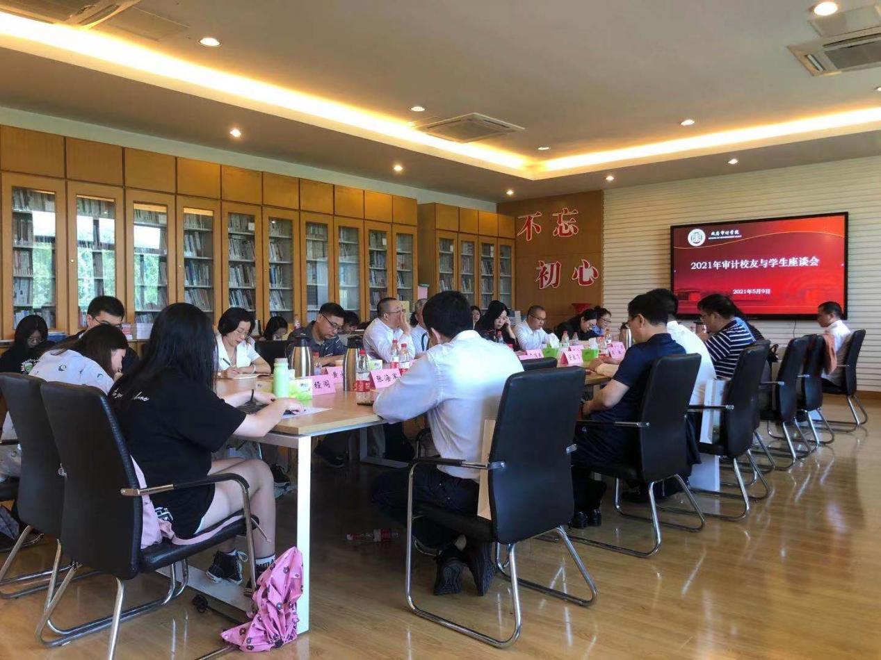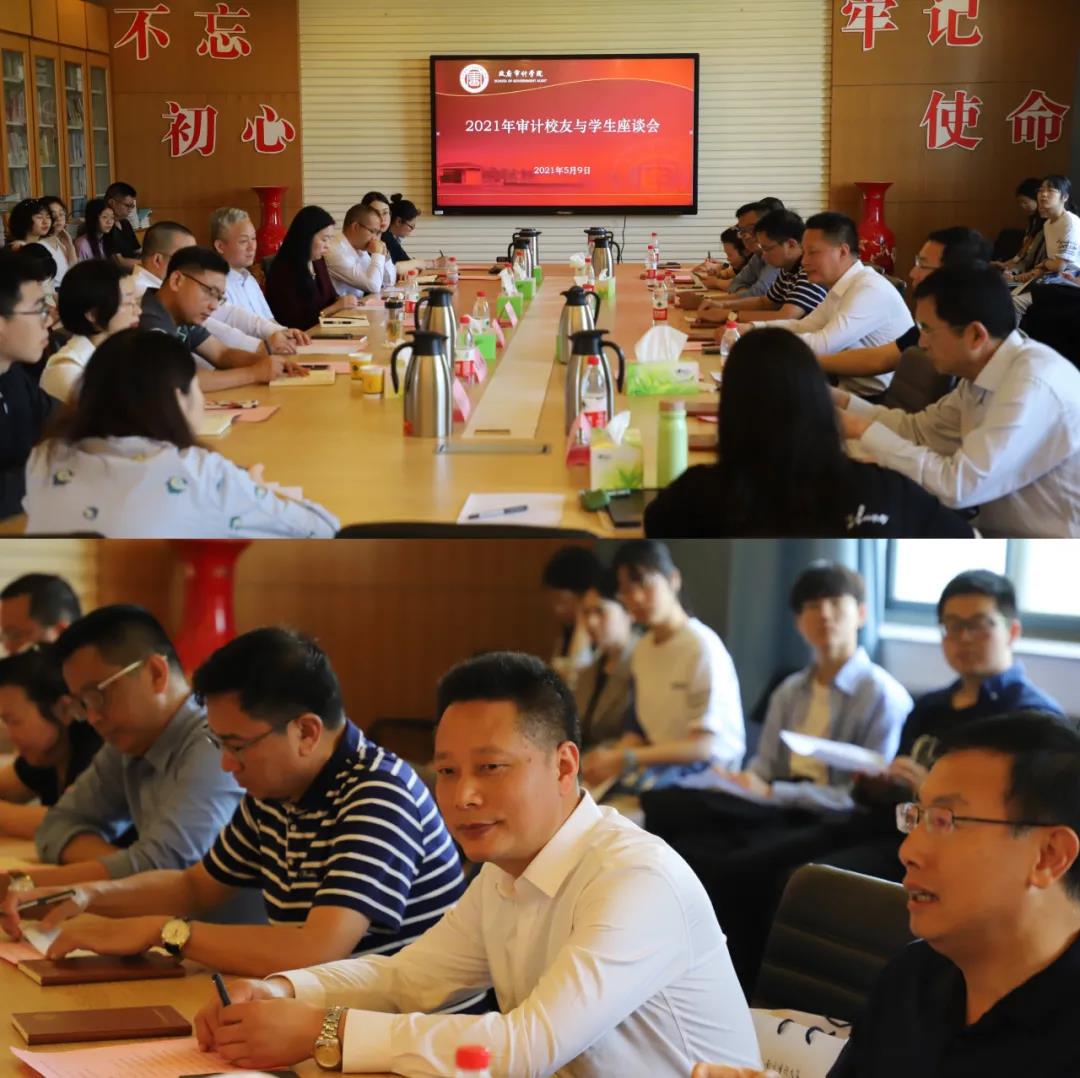 59日上午,政府审计学院2021年审计校友与学生座谈会在敏行楼四楼会议室召开。13位来自各行各业的杰出校友回到学院给学弟学妹们传经送宝。政府审计学院党委书记童瑞连、副院长王士红以及师生代表40多人参加座谈会。