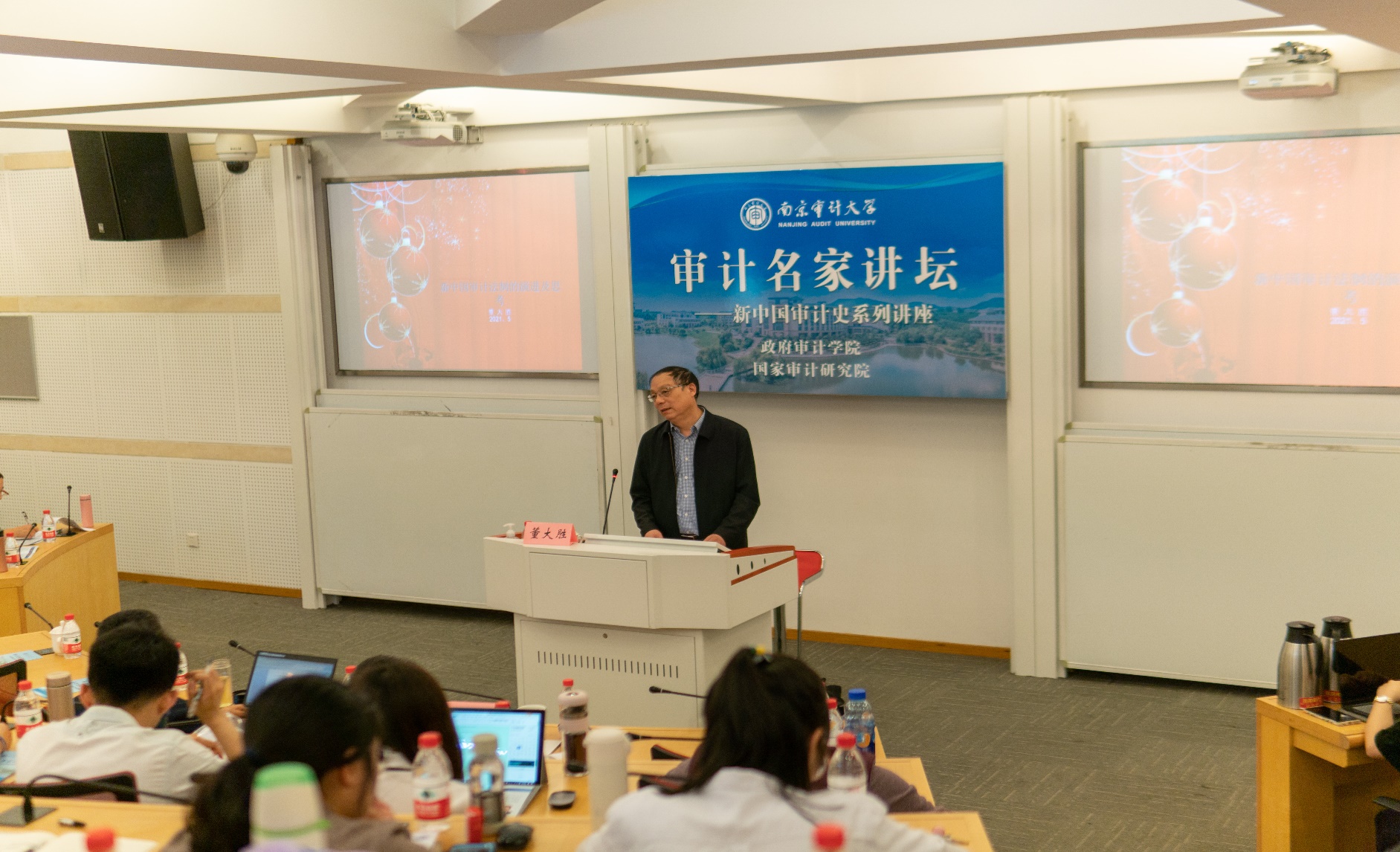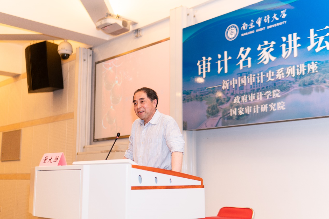 政府审计学院、国家审计研究院联合举办的“审计名家讲坛”——新中国审计史系列讲座在敏行楼102报告厅拉开了序幕。首场报告由审计署原党组副书记、副审计长、中国审计学会原会长董大胜主讲。