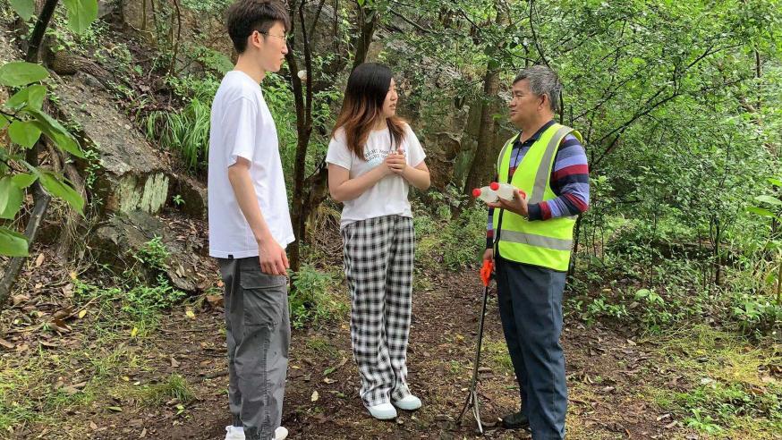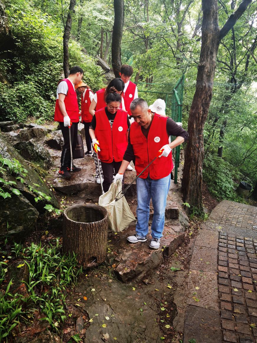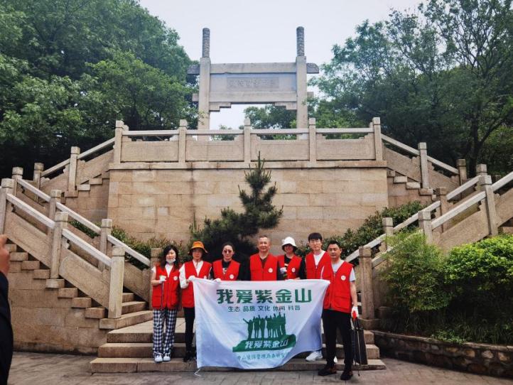 全体人员来到紫金山山顶公园向中山陵园管理局森林管理处马所长询问人员配备、日常工作等基本情况,并纷纷带上手套、拿起夹子与垃圾袋加入了“生态卫士”的队伍。范毅超向正在高温下辛勤工作的保洁员张师傅送去了冰水,并向他了解工作生活中的困难。