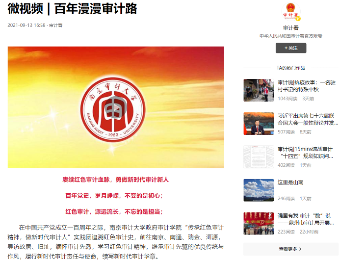 夏寒副教授是政府审计学院“传承红色审计精神,做新时代审计人”实践团指导老师。实践团以“红色审计”为主题,前往江西省瑞金市苏维埃中央审计委员会旧址、广东省河源市阮啸仙故居、江苏省南通市中国审计博物馆等地探寻红色审计源头与发展,取得了一定的成果,获得审计署、中国审计报社、中国青年网、江苏共青团等官方平台累计报道21次。