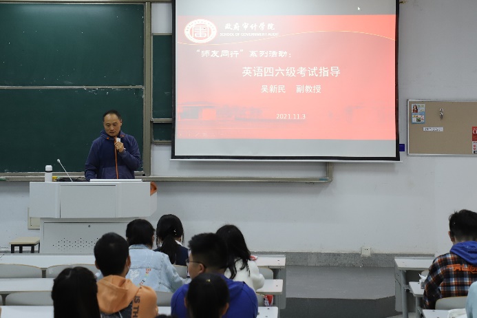 为帮助学生更好地备战四六级考试,提高英语水平, 11月3日,政府审计学院特邀请外国语学院吴新民副教授在竞秀楼N107为同学们开展一场关于英语四六级作文备考策略讲座。