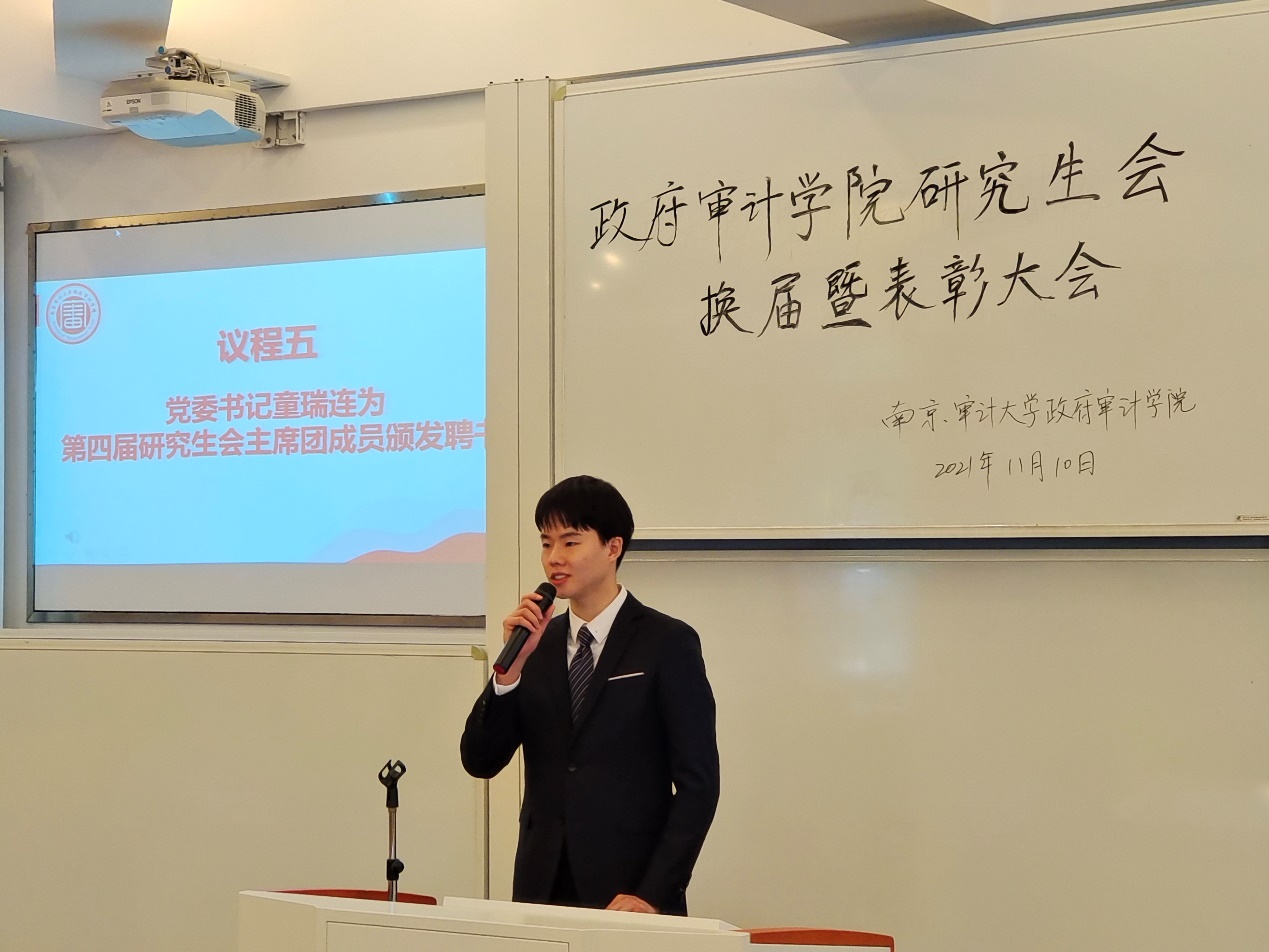 学科办主任吴雪莹宣读《关于聘任政府审计学院第四届研究生会主席团的决定》。