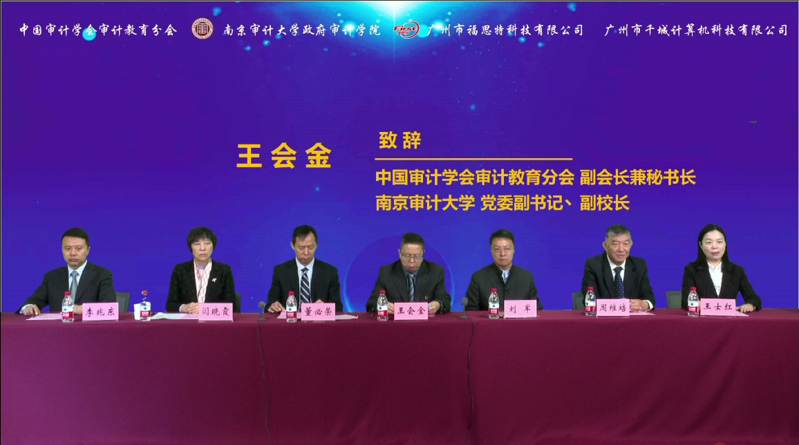 中国审计学会会长孙宝厚、江苏省教育厅高教处处长邵进通过视频方式出席开幕式并致辞。审计署审计干部教育学院副院长刘军,我校党委副书记、副校长王会金,广州市福思特科技有限公司董事长闫晓霞出席,政府审计学院院长周维培、执行院长王士红、副院长李兆东参加开幕式。我校副校长董必荣主持开幕式。