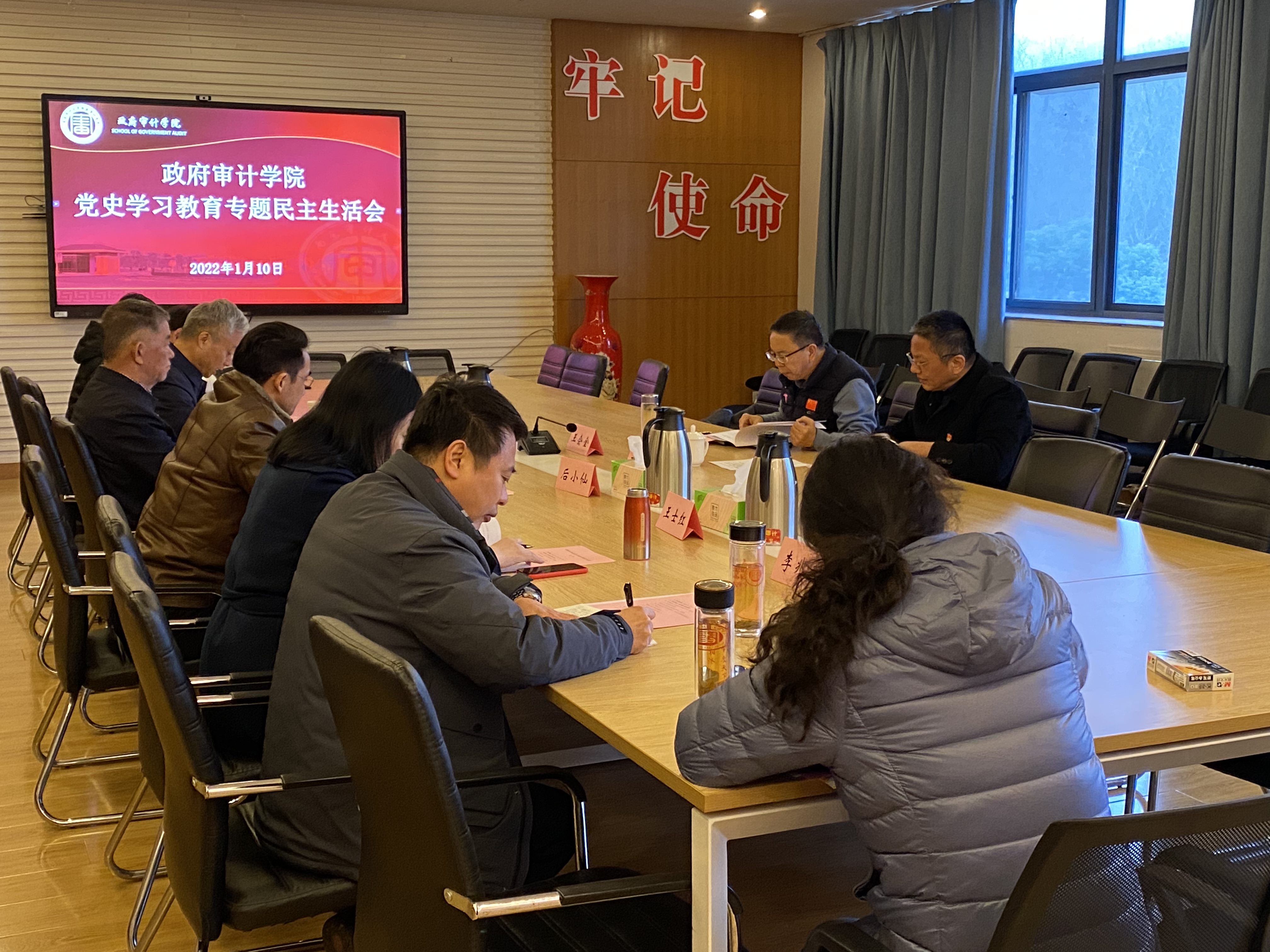 2022年1月10日上午,政府审计学院党史学习教育专题民主生活会在敏行楼四楼会议室召开,校党委副书记、副校长王会金,校纪委委员、校督导组成员张勇到会指导。学院党员处级班子成员参加了会议,党外班子成员列席会议。会议由学院党委书记童瑞连主持。