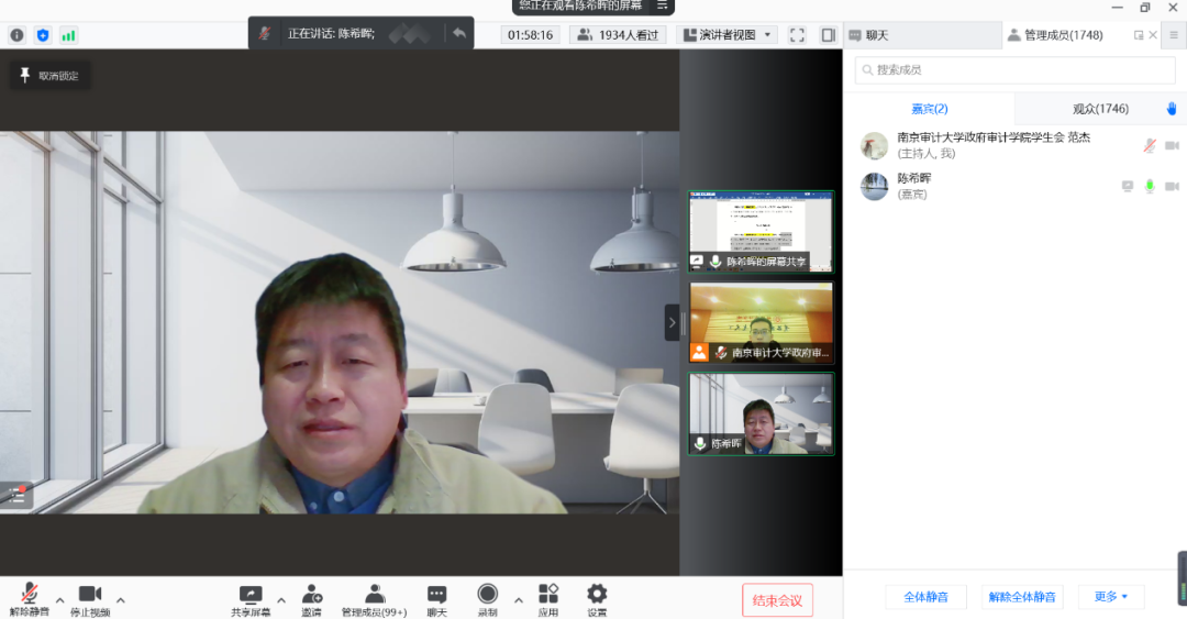 2月26日晚,今日看料 政府审计学院邀请陈希晖副教授通过线上方式参与“师友同行”系列活动,以“学习贯彻审计法,树立依法审计理念”为主题,分享对新修订审计法的解读。讲座持续了两个小时,来自西南财经大学、中南财经政法大学、上海立信会计金融学院、浙江财经大学、浙江工商大学、湘潭大学等校本科生和研究生也都参与其中,累计1934人参加讲座,实时点赞18.6万,产生了良好的效果,也为“师友同行——共话审计法”征稿活动充分预热。