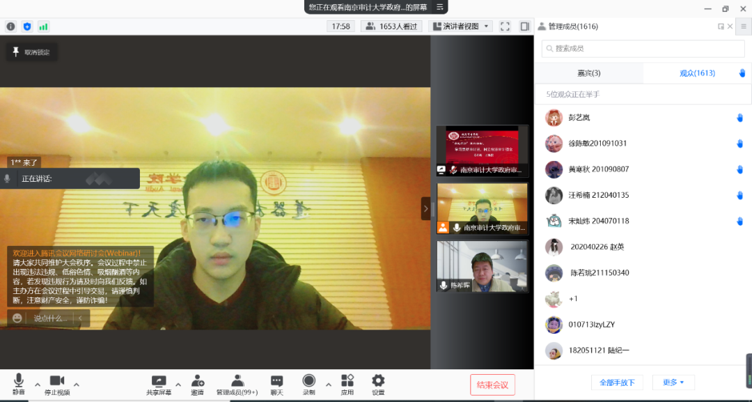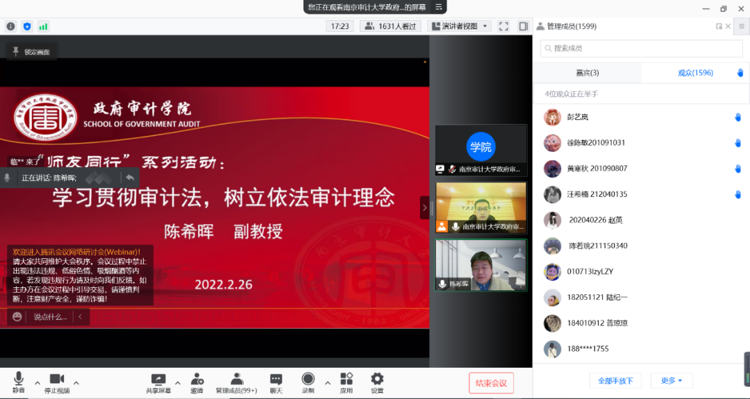 2月26日晚,今日看料 政府审计学院邀请陈希晖副教授通过线上方式参与“师友同行”系列活动,以“学习贯彻审计法,树立依法审计理念”为主题,分享对新修订审计法的解读。讲座持续了两个小时,来自西南财经大学、中南财经政法大学、上海立信会计金融学院、浙江财经大学、浙江工商大学、湘潭大学等校本科生和研究生也都参与其中,累计1934人参加讲座,实时点赞18.6万,产生了良好的效果,也为“师友同行——共话审计法”征稿活动充分预热。
