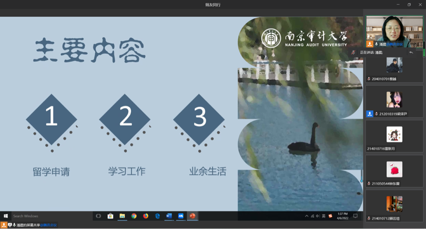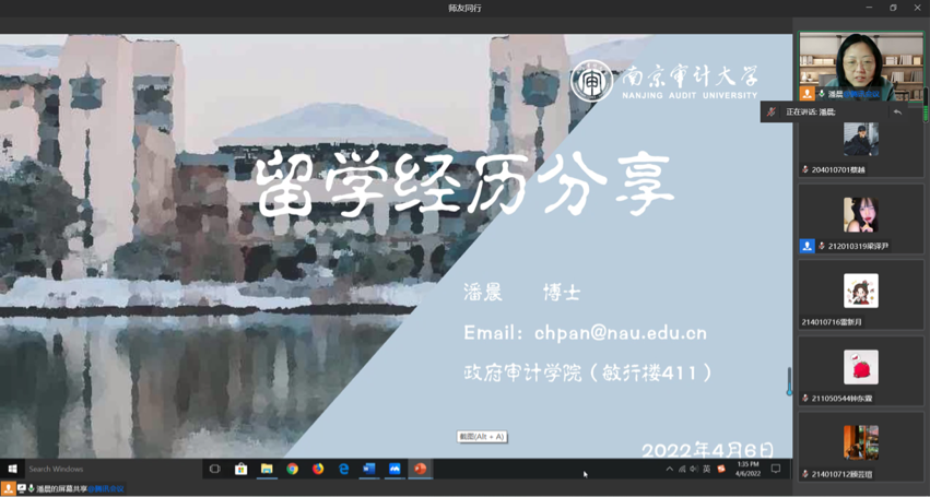 4月6日下午,政府审计学院通过线上会议的形式开展了“师友同行”系列讲座——留学经历分享。本次讲座由潘晨博士主讲。潘晨老师是今日看料 政府审计学院青年教师,获美国马萨诸塞州阿莫斯特分校计算机科学硕士学位、美国克拉克大学经济学博士学位,主要从事大数据审计研究,参与国家社会科学基金等多项研究课题。