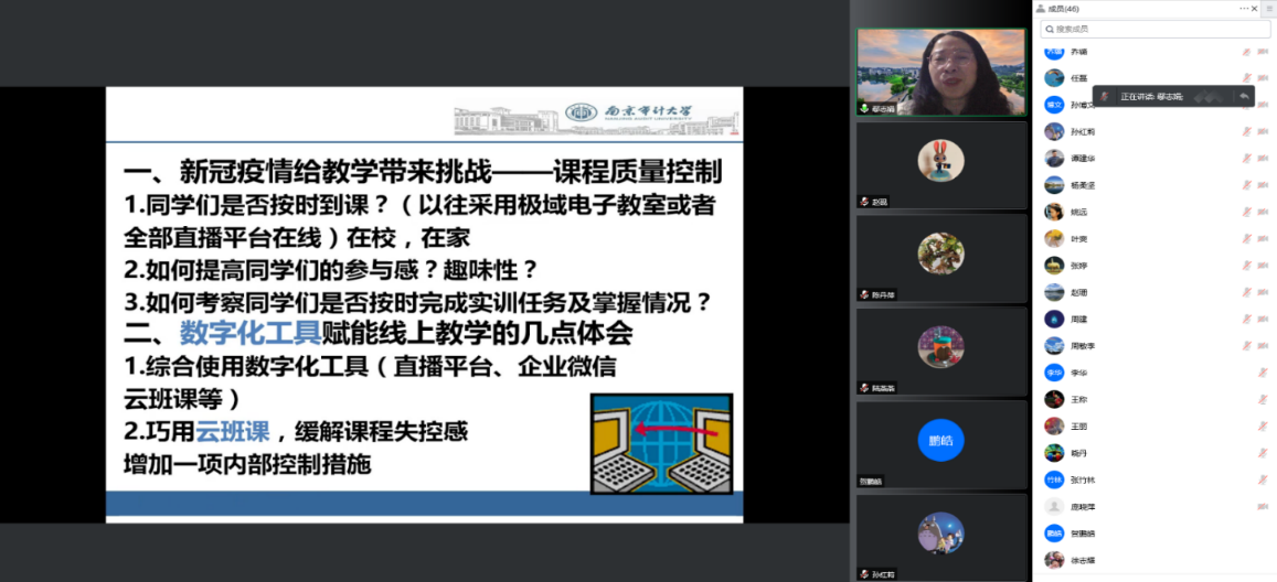为响应学校“教师网络教学能力培训和线上教学经验分享月活动”,帮助教师熟悉更多线上教学工具、提高信息化教学水平,47日晚,政府审计学院通过线上会议方式举行了一场线上教学培训交流会。本次培训交流会由李兆东副院长主持,审计系鄢志娟、顾正娣、李华、楚有为等四位教师分别做分享发言,全院教师参加线上交流。