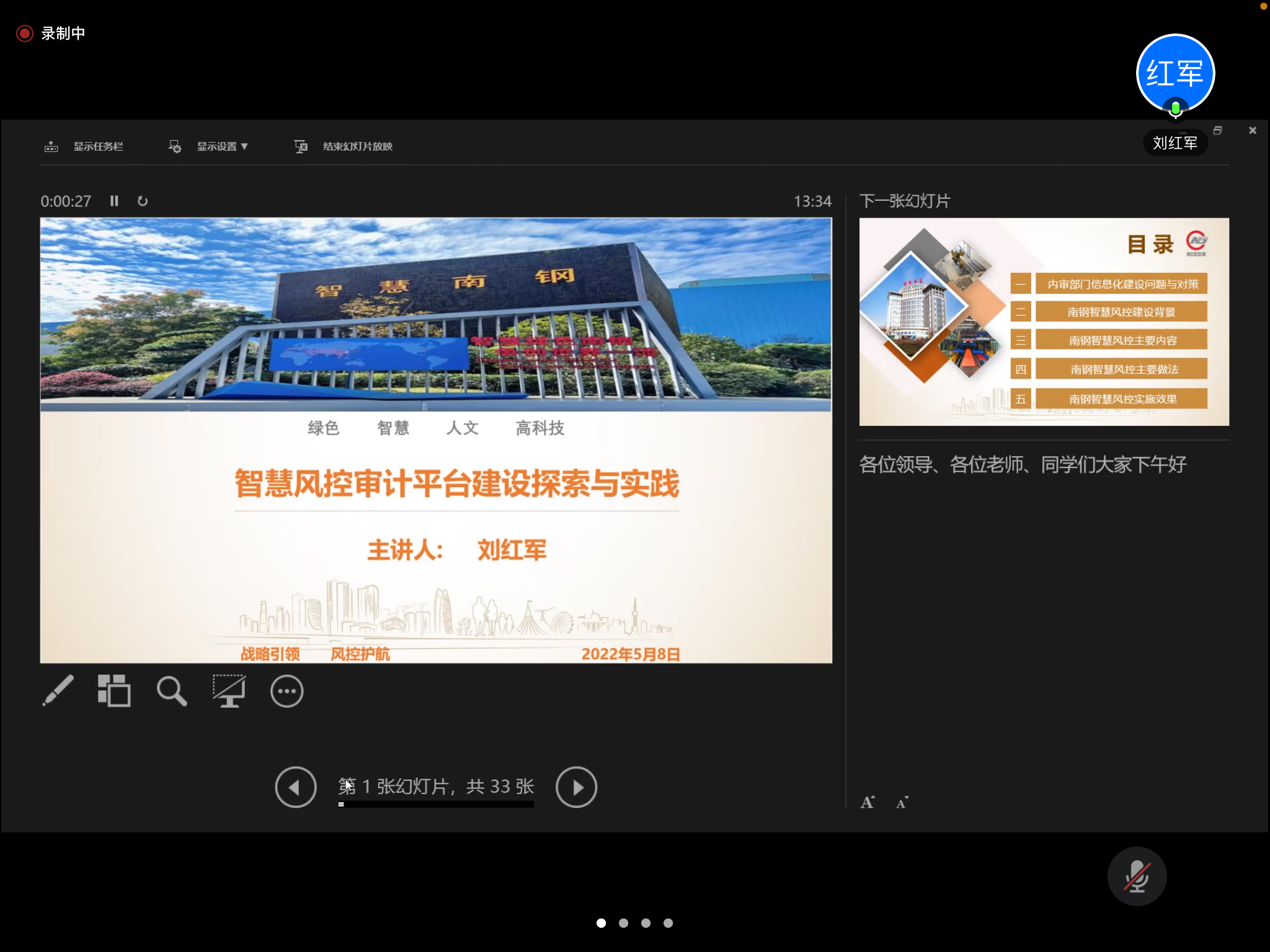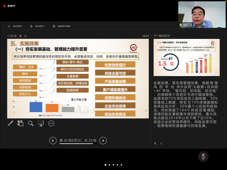 5月8日下午,政府审计学院通过线上会议的形式开展了“师友同行”系列第四十四期主题讲座——智慧风控审计平台建设探索与实践。本次讲座主讲嘉宾是南京钢铁股份有限公司监事刘红军部长。刘红军是国际内部控制协会的高级国际内部注册控制师、国际反舞弊协会的国际注册反舞弊师;2009年-2019年,先后担任南钢联合有限公司纪检监察主任、廉政监察部负责人;2019年至今,任南钢联合有限公司风险控制部负责人。