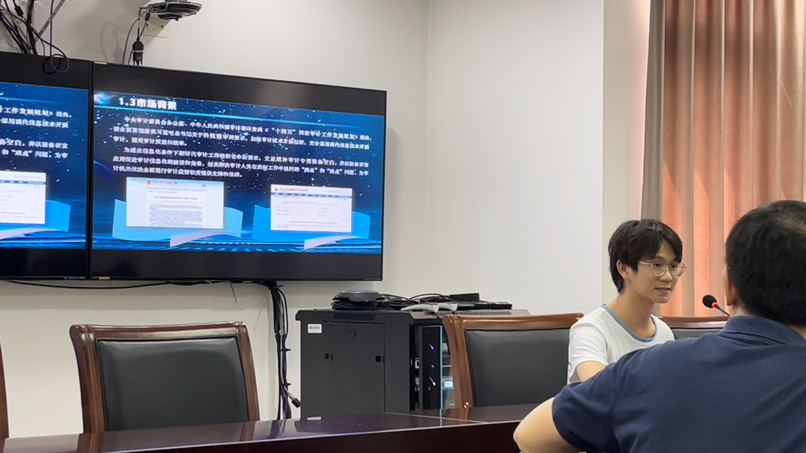 随后由团队成员李立增同学为大家介绍实践团队的研究项目“软硬件一体化——审计移动工作平台”,从真实发生的案例出发指出目前的自然资源审计存在的痛点和难点,融合视频方式充分展示了团队研发的“审计移动工作平台”。该平台着眼于自然资源审计和工程投资审计前沿技术,将软硬件一体化集成到一辆车上,打造审计人专属的审计车。