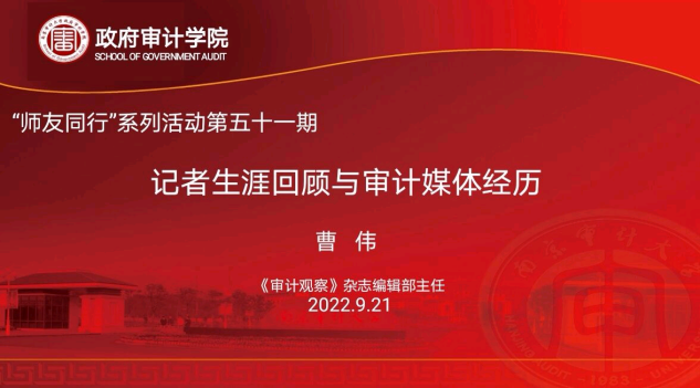 9月21日下午,政府审计学院在线上开展了“师友同行”系列第五十一期主题讲座——记者生涯回顾与审计媒体经历。本次讲座邀请到《审计观察》杂志编辑部主任曹伟作为主讲人,李兆东副院长主持讲座。曹主任有着十余年中央重点新闻单位工作经验,专注时政、宏观经济、区域经济等领域报道,2017年参与《审计观察》杂志的创刊工作并担任编辑部负责人,5年来期刊影响力和发行量稳步提升,杂志有着庞大的专业作者资源与读者群。