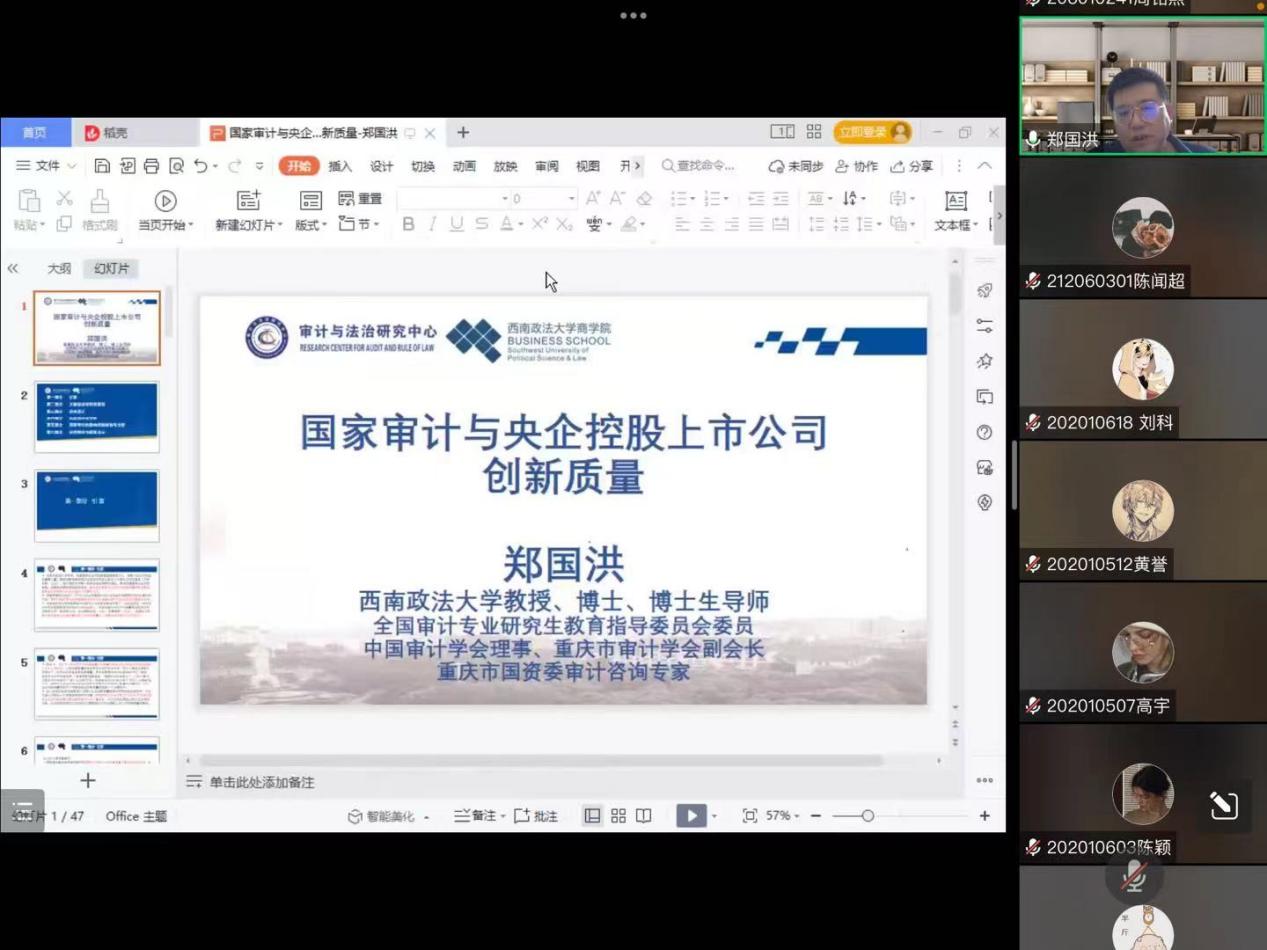 9月22日下午,应政府审计学院邀请,中国审计学会理事、西南政法大学商学院(监察审计)学院副院长、博士生导师郑国洪教授做客“审计名家讲坛”作题为“国家审计与央企控股上市公司创新质量”的讲座。讲座由政府审计学院执行院长王士红教授主持,260余名师生聆听了讲座。