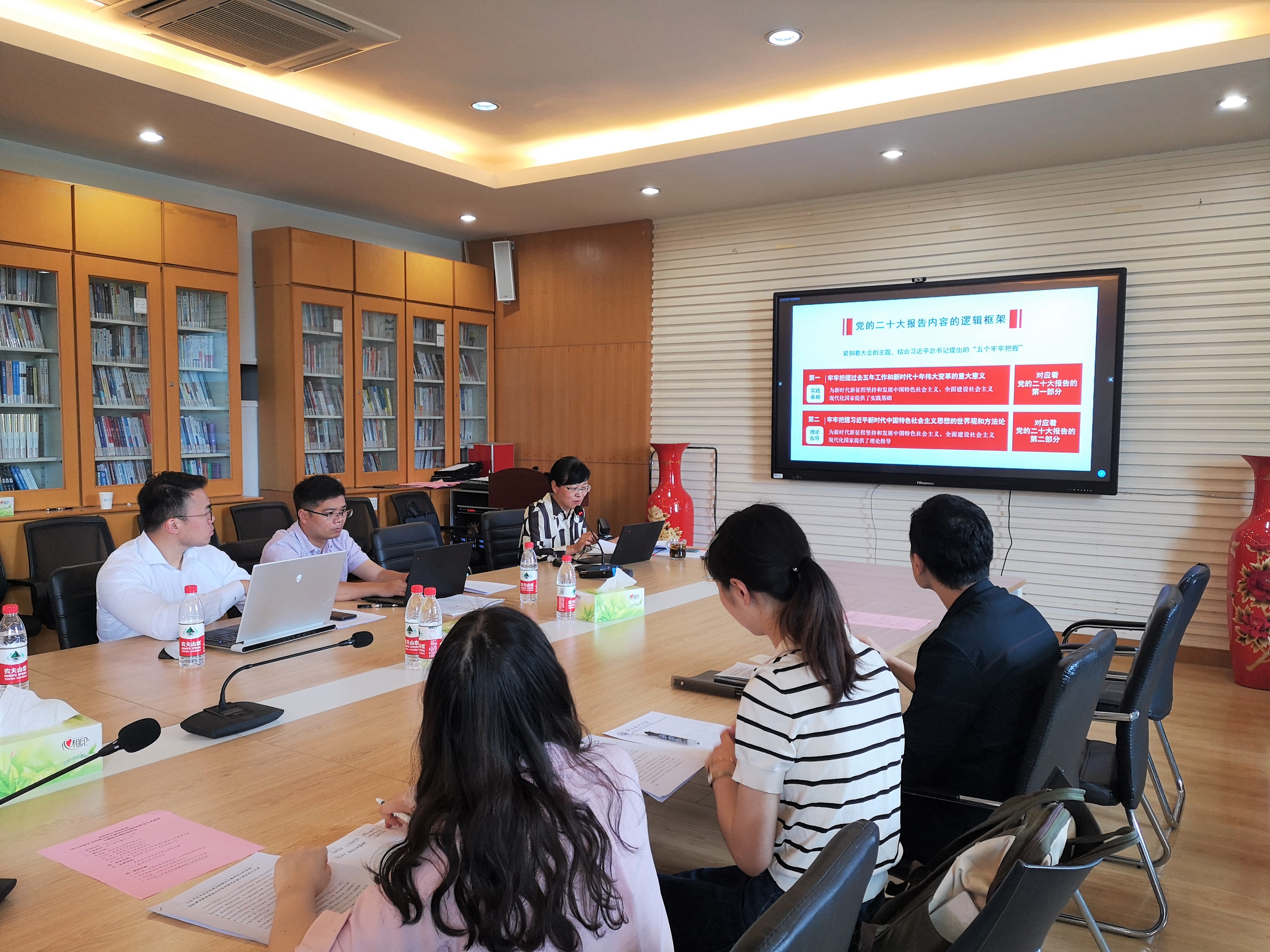 李海燕同志作学习总结。她指出,党的二十大报告内涵丰富、博大精深,需要我们坚持深入学,常学常新;结合工作学,常悟常进;真正把党的二十大精神内化为推动学校、学院事业发展的强大动力。